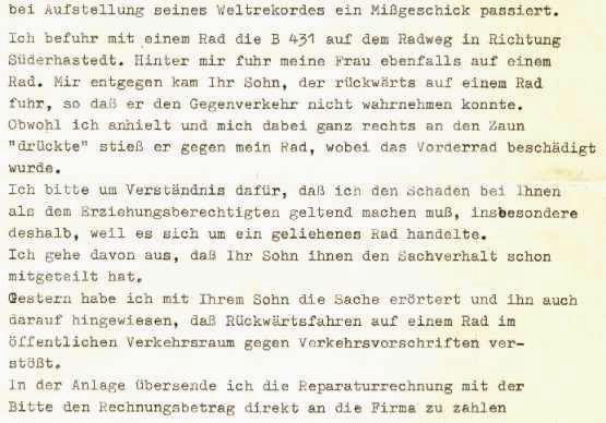 Bereits im Jahre 1979 stellte Christian Adam am 7.Oktober unter Aufsicht des örtlichen Bürgermeisters Sprengel eine Guinness - Rekordfahrt, allerdings ohne Geige im Fahrrad rückwärts fahren auf. Der ganze Spaß dauerte gut 6 Stunden und endete nach 113,3 Kilometern mit einem unangenehmen Zwischenfall. Ein Wochenendausflügler befuhr die gleiche, nicht abgesperrte Strecke mit seiner Frau und entpuppte sich ausgerechnet als Polizeihauptkommissar des Nachbarortes, der nichts von der ganzen Aktivität wusste. Es gab rechtsbelehrende Worte an den Verkehrsraudi und einen Brief samt Rechnung (40,-DM) an die erziehungsberechtigten Eltern.